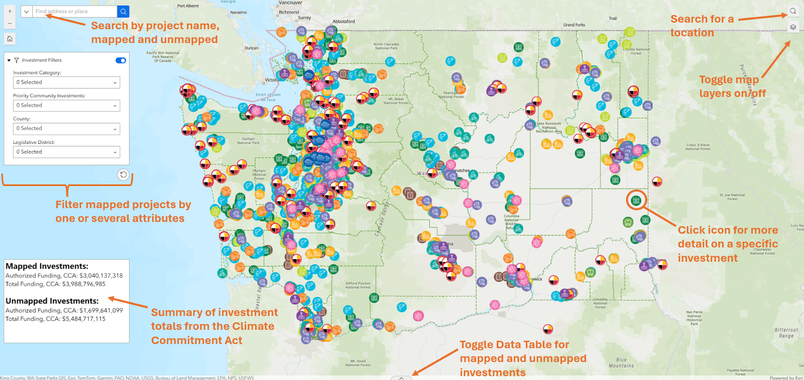 Washington’s climate commitments can be explored through our interactive educational mapping tool that offers clarity, transparency, and detailed information about state-directed investments. Understanding the breadth of Washington’s climate commitments gives users the opportunity to explore where the state is investing Climate Commitment Act revenues and better equips the public to assess and provide feedback on the use of state revenue to achieve the stated aims of this market-based, long-term pollution reduction, clean energy innovation, and climate resilience program.