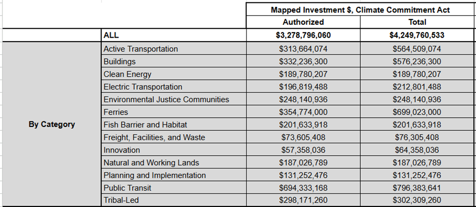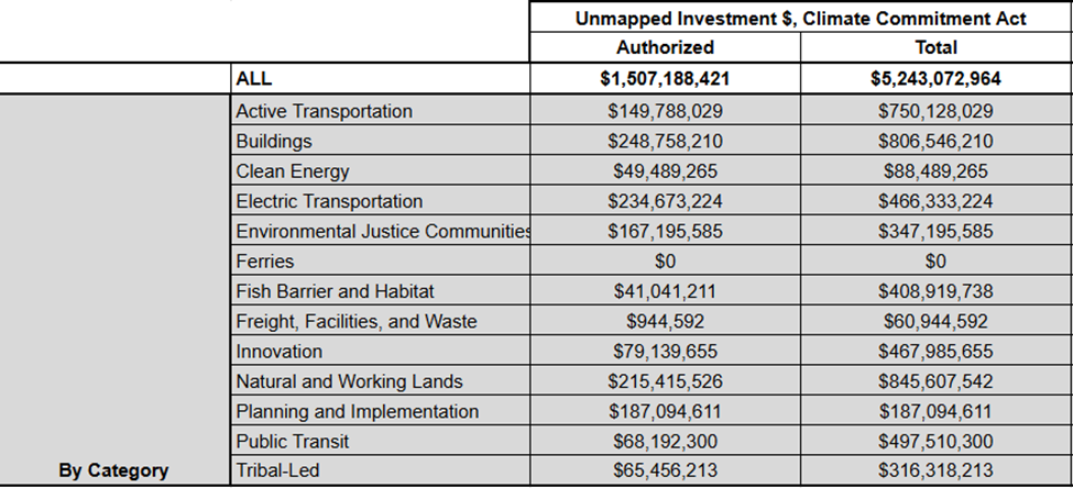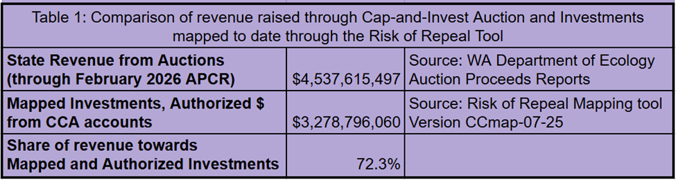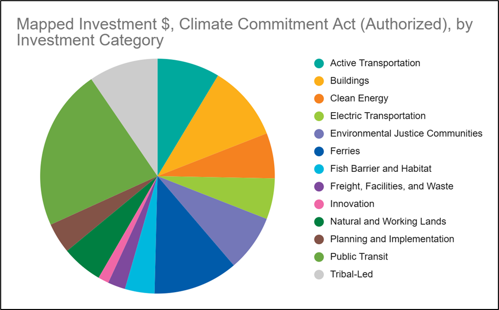 Summary Data Summary level data Table 1: Comparison of revenue raised through Cap-and-Invest Auction and Investments mapped to date through the mapping tool. Summary Level Charts, Mapped Investments Summary Level Data, Investment Categories